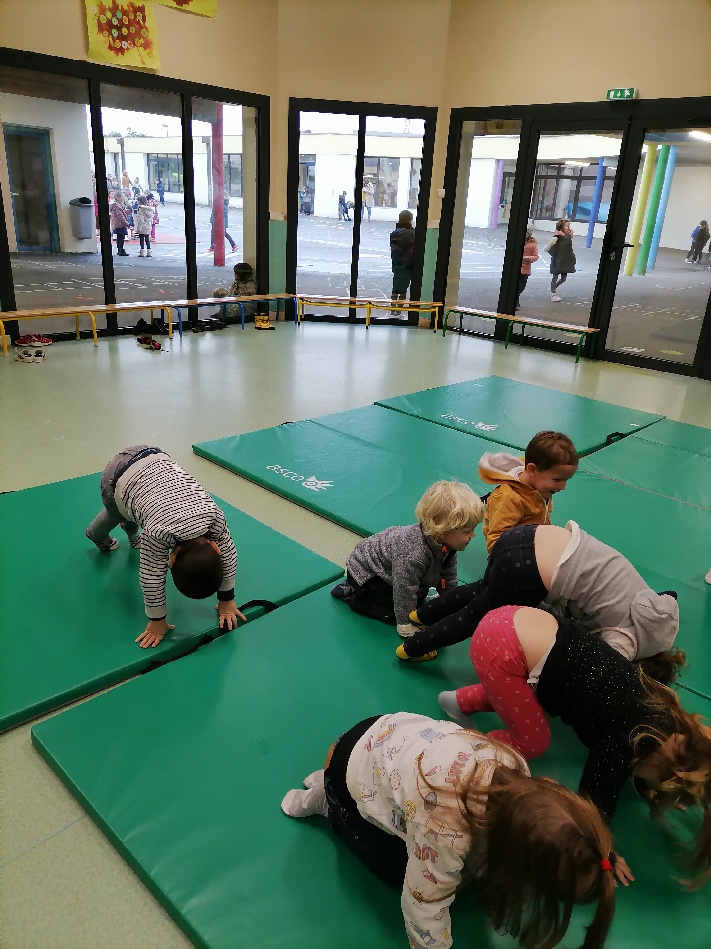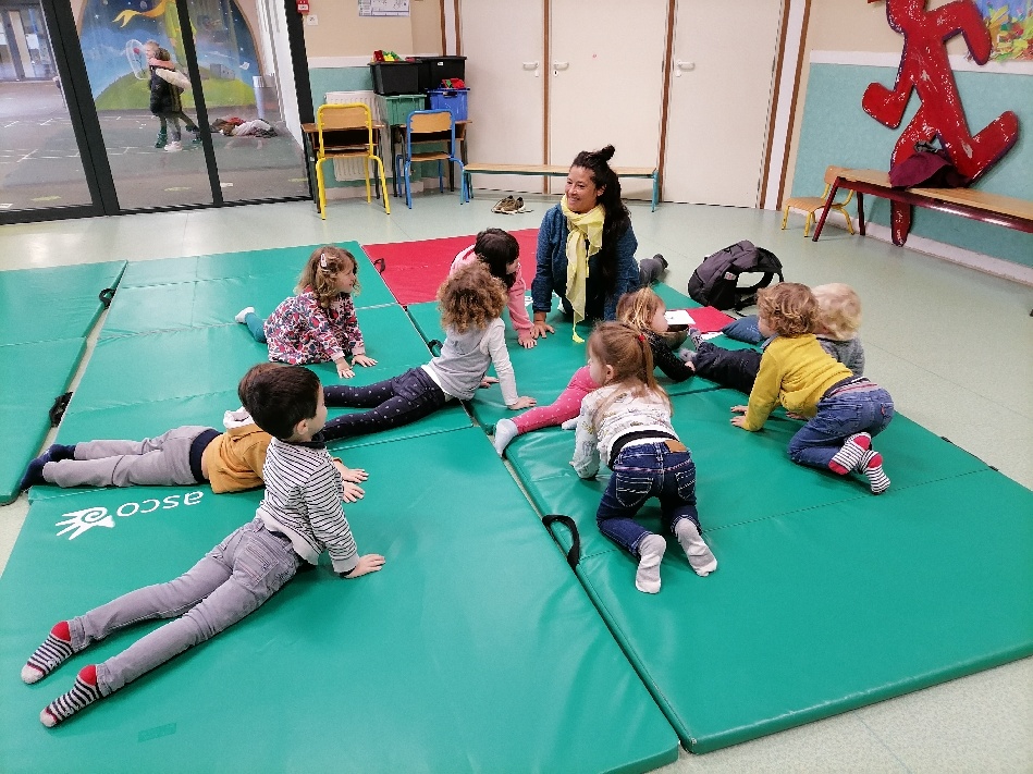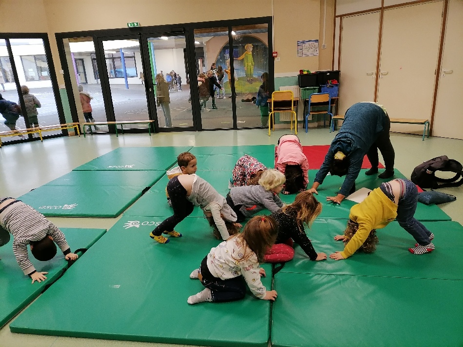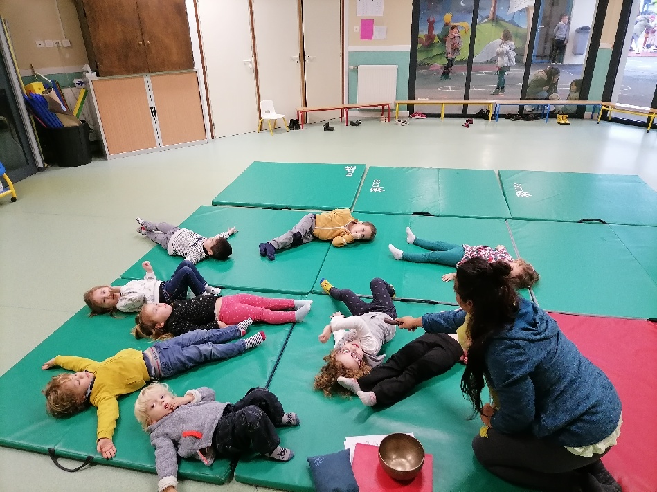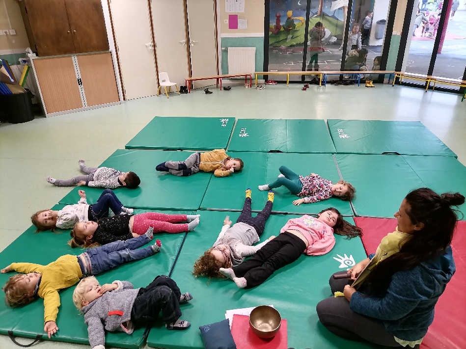 Aujourd’hui, les séances de yoga avec Dephine Guermeur ont débuté! D’abord en demi-groupe dans la salle de motricité.